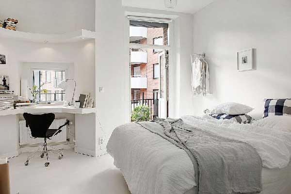 Tuân thủ phương pháp thiết kế đơn giản với quy tắc về màu sắc trắng được sửu dụng trong thiết kế hợp với đồ nội thất thông minh, đáp ứng đủ một không gian 15m2 nhưng đầy đủ tiện nghi cho gia chủ. Một chiếc giường cao hơn rất nhiều so với bình thường bởi phía dưới gầm là tủ đồ có thể kéo ra để đựng quần áo hay những vật dụng cần thiết. Phía đuôi giường là chiếc gương kết hợp tủ dạng đứng. Mọi thứ bé nhỏ nhưng mang trong mình đầy công năng.