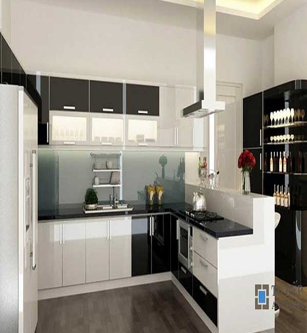 Mẫu tủ bếp tiếp theo chúng ta thấy sự sáng bóng của bề mặt tủ bếp, khiến cho quá trình vệ sinh, lau chùi căn phòng bếp càng trở lên thuận tiện hơn. Tone màu trắng là chủ đạo đã góp phần làm bật điểm nhấn màu đen của mẫu thiết kế này.