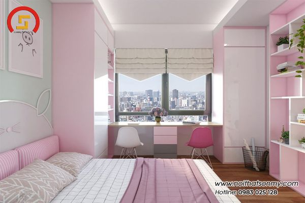 Với những gia đình có một vài cô công chúa thì màu hồng luôn là màu được yêu thích nhất. Chúng tạo được cảm giác ngọt ngào, thanh khiết, mỏng manh nhưng không hề yếu đuối. Gam màu này cũng có thể kết hợp được với rất nhiều màu sắc khác nhau giúp phòng ngủ thêm mắt mắt, hạn chế được sự đơn điệu.