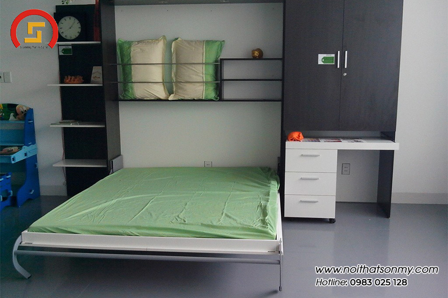 Với việc sử dụng giường gấp, bạn hoàn toàn có thể kê các vật dụng khác như: bàn làm việc lớn, ghế xoay… Khi chiếc giường biến mất, phòng làm việc sẽ gọn gàng và rộng rãi hơn rất nhiều.