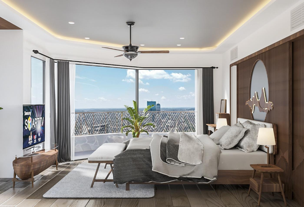 Thiết kế này sở hữu tầm nhìn vô cùng ấn tượng. Thiết kế phóng khoáng khi mạnh mẽ thay thế vách bê tông bằng tường kính trong suốt, giúp bạn ôm trọn những khoảnh khắc lung linh, rực rỡ của khung cảnh xung quanh. Ban ngày, bạn cũng có thể điều chỉnh ánh sáng phù hợp với nhu cầu qua hệ thống rèm cửa tự động. Màu sắc chủ đạo của căn phòng cũng vô cùng nhẹ nhàng để tạo cảm giác thoải mái, thư giãn điểm xuyết bình hoa tươi thơm ngát mang đến cảm nhận đầy lãng mạn.